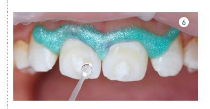 Il prodotto e stato attivato con uno spazzolino in gomma a 500 giri/minuto (Fig. 4). Al termine dell'applicazione il prodotto e stato aspirato, sciacquato e asciugato. Dopo aver ripetuto il passaggio per 4 volte, le discromie sono risultate esposte nella loro integrità e con i bordi ben definiti. A questo punto è stato eseguito il trattamento con IconR . Con l’aiuto del Tip vestibolare contenuto nel kit e stato applicato sulla zona da trattare il gel mordenzante Icon- Etch (HCl al 15%) che prepara il dente ad essere infiltrato, rimuovendo circa 40 μm di superficie dello smalto (Fig. 5).