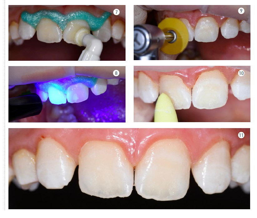 Le superfici dentali sono stati lucidati con la pasta da profilassi SuperPolish Kerr, utilizzando uno spazzolino montato su contrangolo per eliminare qualsiasi biofilm e le proteine salivari correlate (Fig. 3). Completata la lucidatura e stata applicata la diga liquida fotopolimerizzante OpalDamR (Ultradent) sia sulla gengiva che sui denti accanto a quelli da trattare. Dopo aver isolato il campo e stato applicato il prodotto OpalustreR(Ultradent), una pasta viscosa a base idrosolubile contenente il 6,6% di Acido Cloridrico con microparticelle di Carburo di Silicio, sulle lesioni con uno spessore di circa 1 mm per 60 secondi.